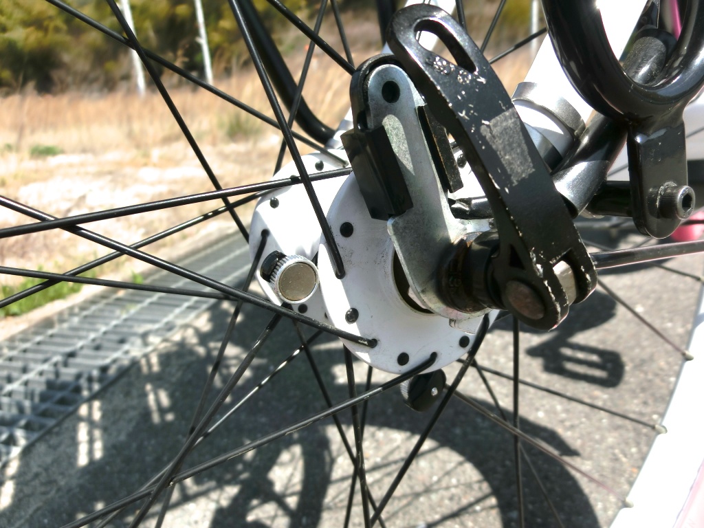そして前輪の速度センサーの磁石の円盤を外してサイクルコンピューター CATEYEのスポーク用マグネットを4つ購入して裏表交互に装着